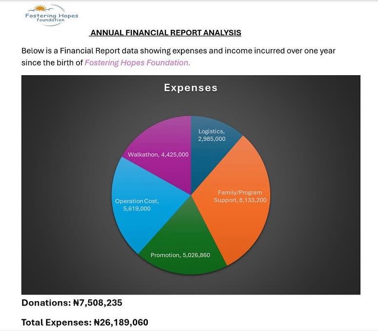 It’s been a wild and impactful year. In Fostering Hopes Foundation’s inaugural year, expenses were allocated across five main categories: Family/Program Support (₦8,133,200), Logistics (₦2,985,000), Promotion (₦5,026,860), Operational Costs (₦5,619,000), and the Walkathon/Event (₦4,425,000).